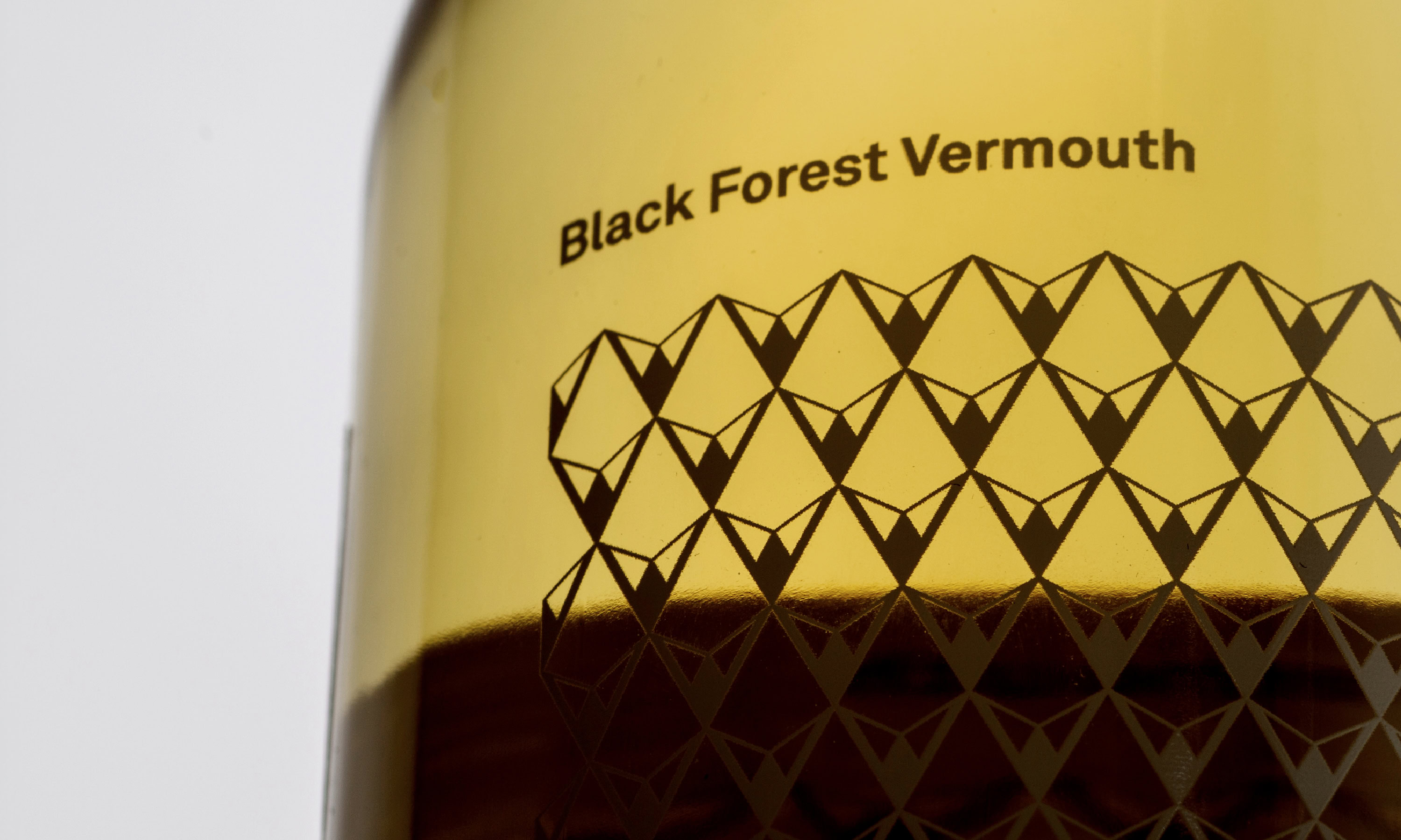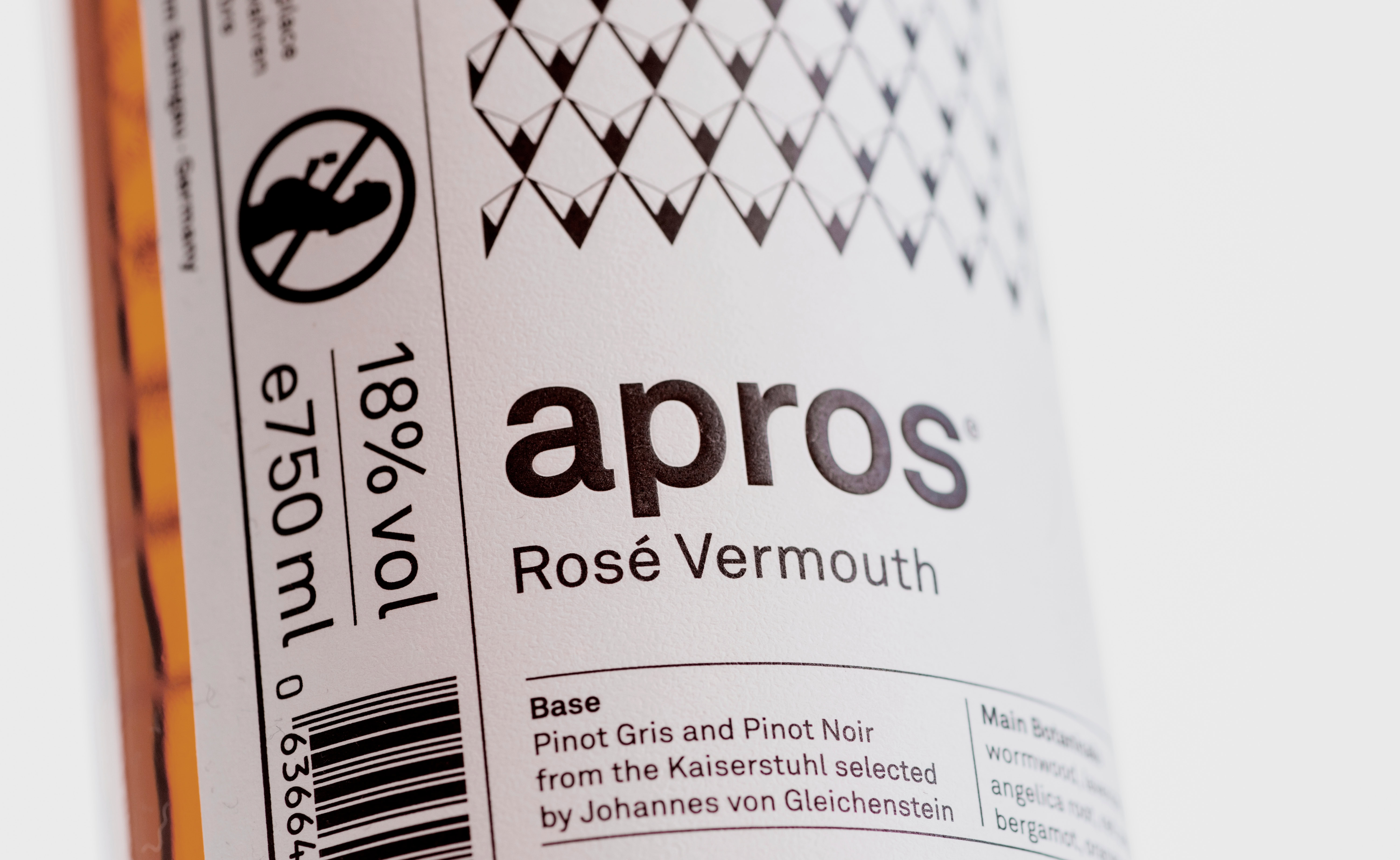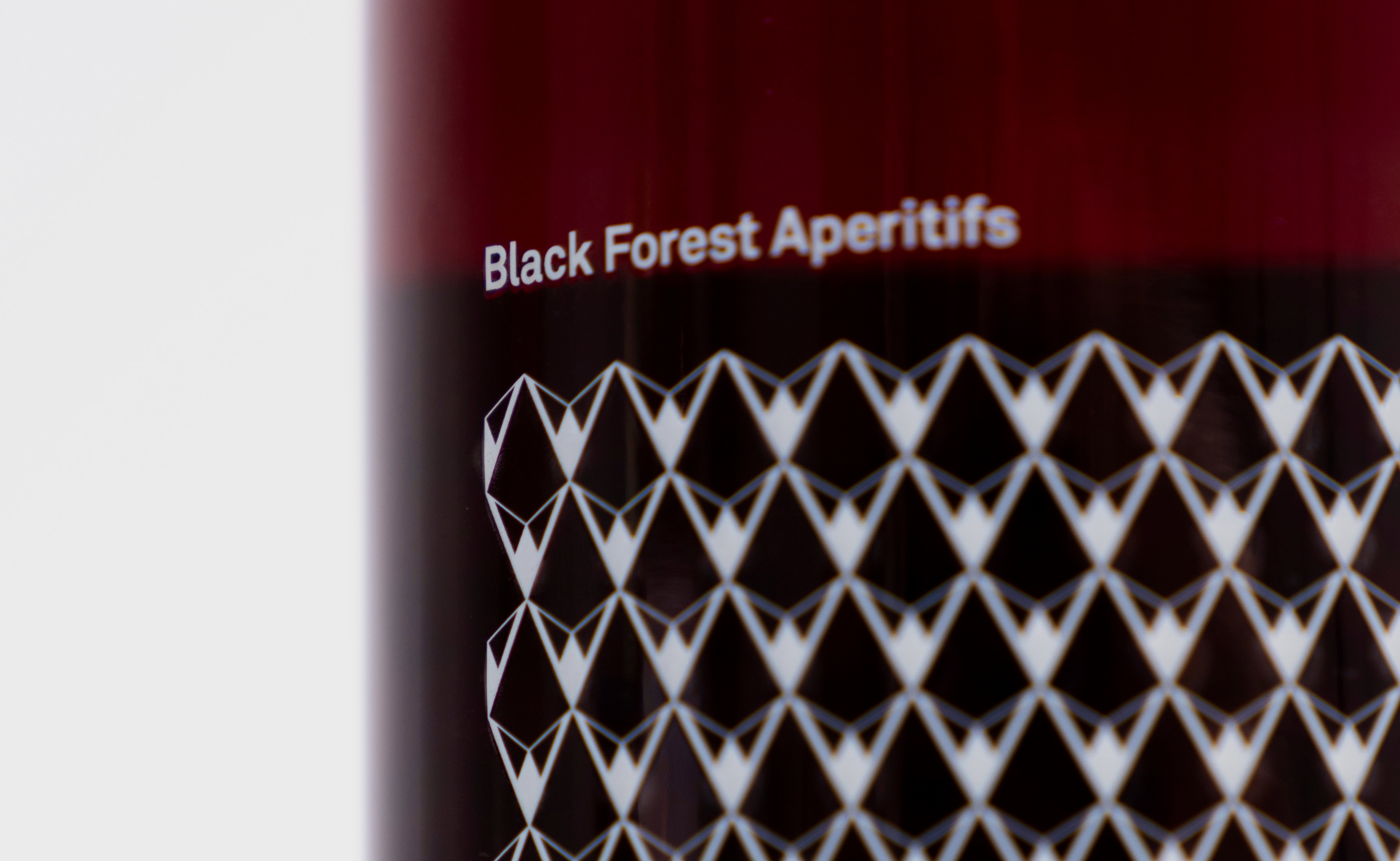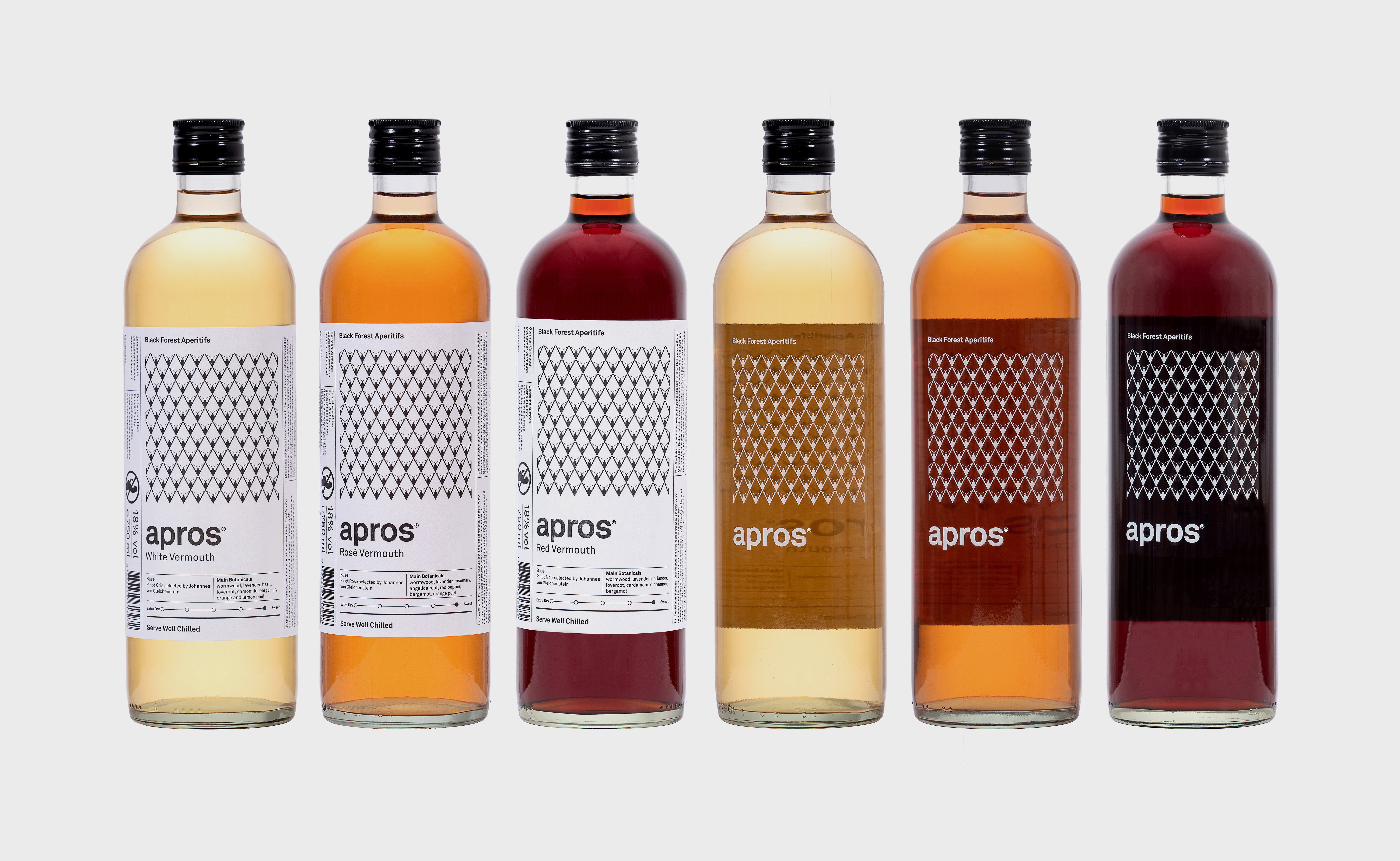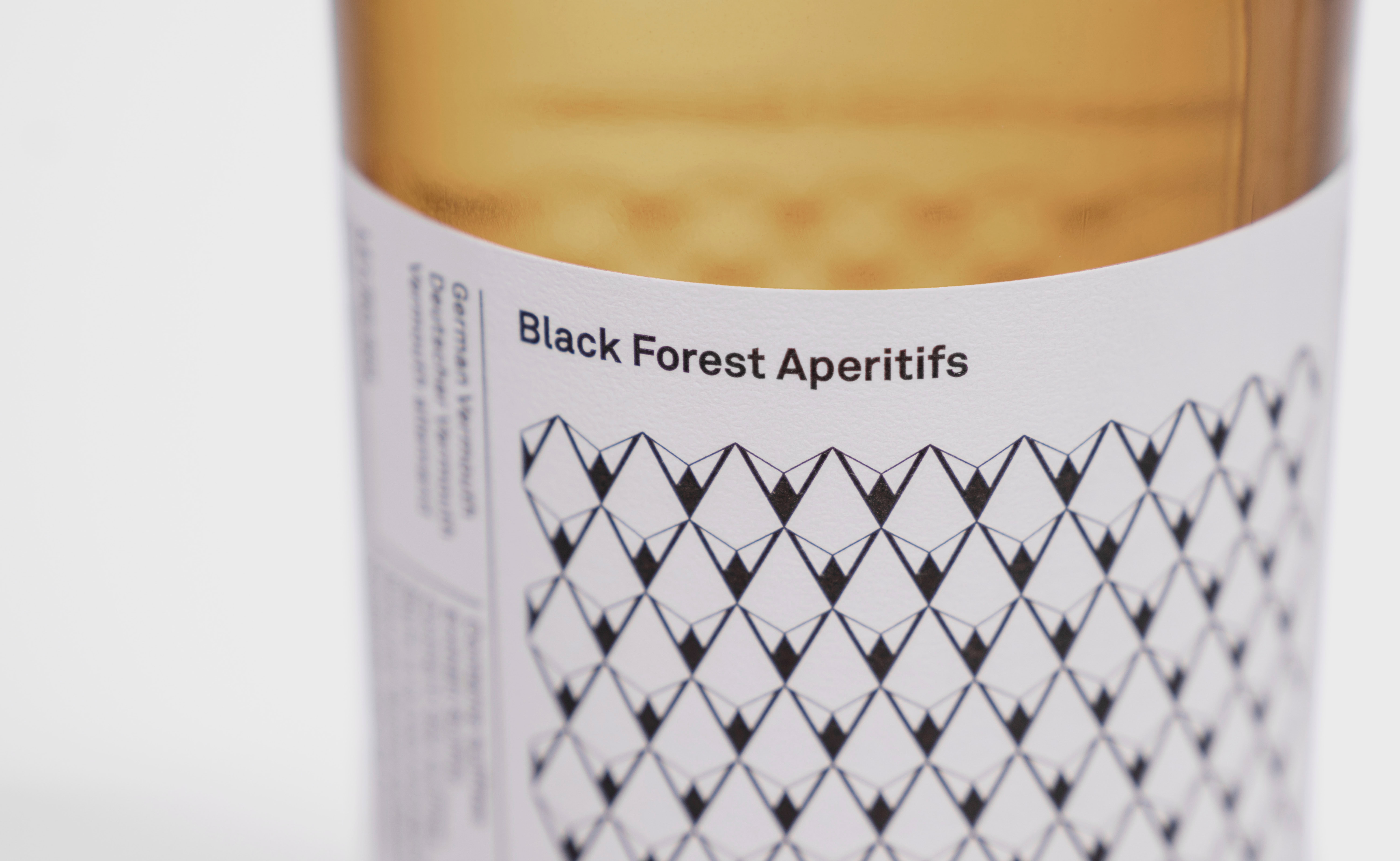 Keine Schnörkel, kein Chichi. Das Packaging von apros Black Forest Vermouth ist puristisch und unkonventionell. Zentrales Element ist ein grafisches Muster, das in abstrahierter Form Berge, Täler, Tannen, Zapfen und Schnee zitiert – die Facetten seiner Heimat. Die Farbgebung des Produkts steht hierbei stets im Mittelpunkt. Verstärkt wird dieser Effekt durch die Schmuckseite.