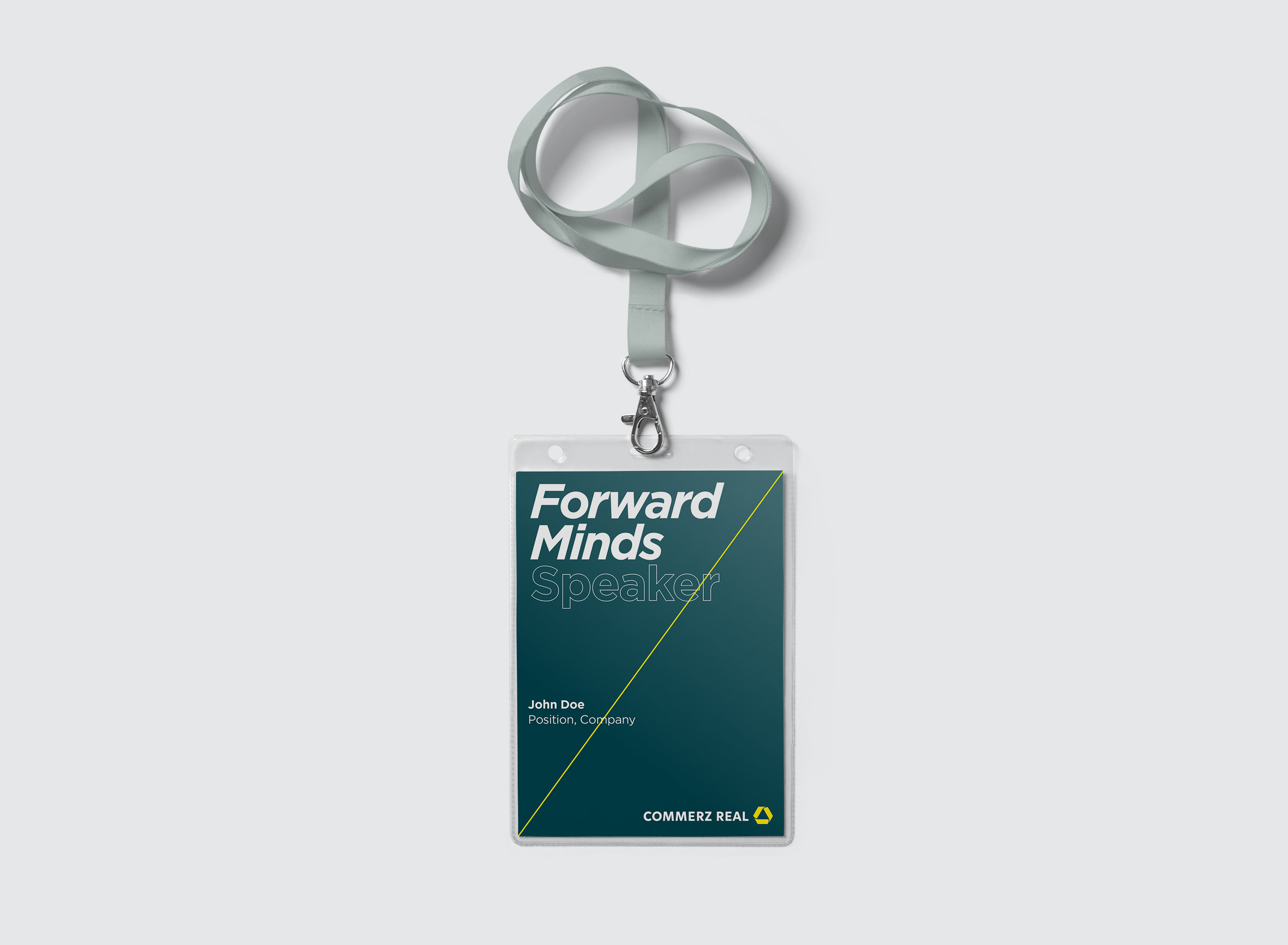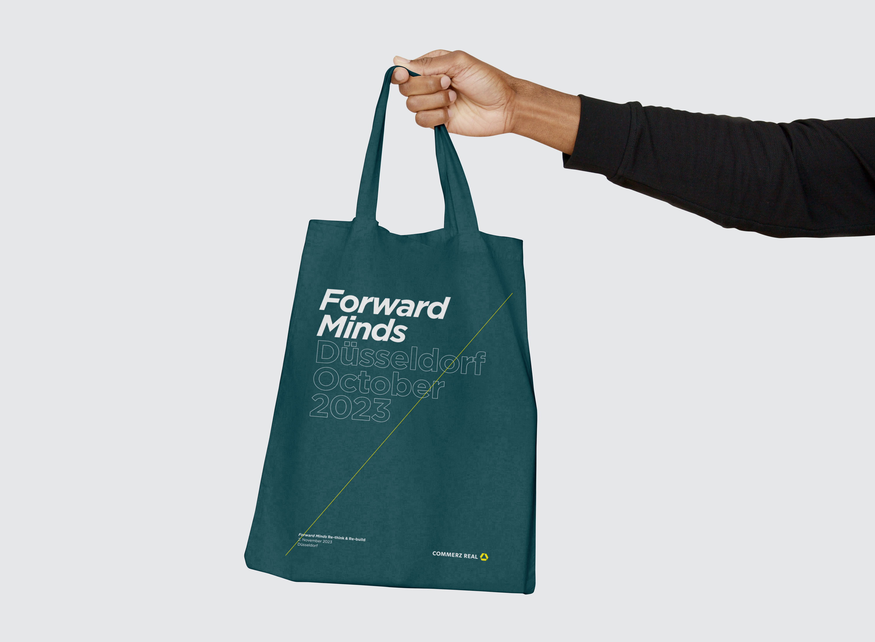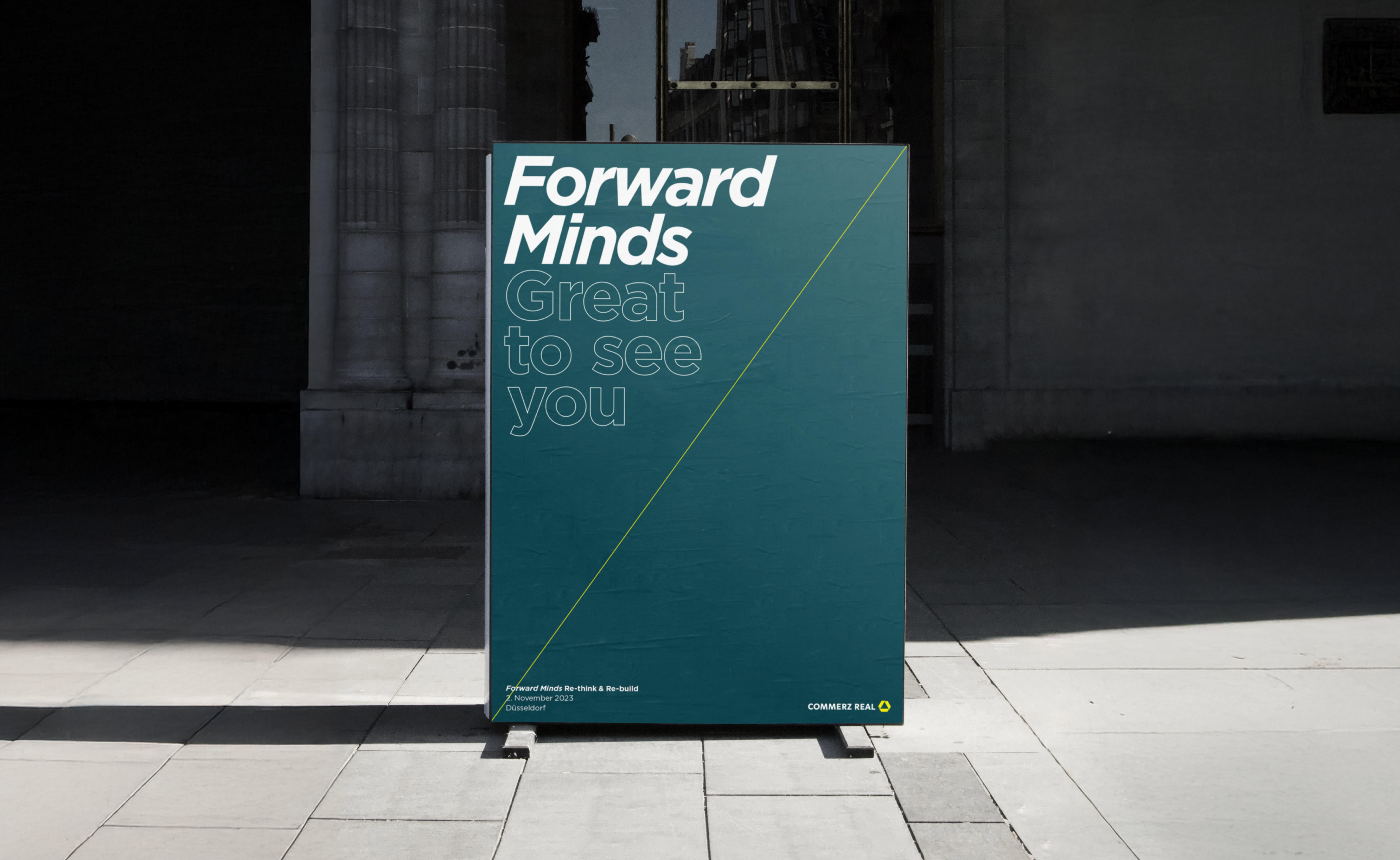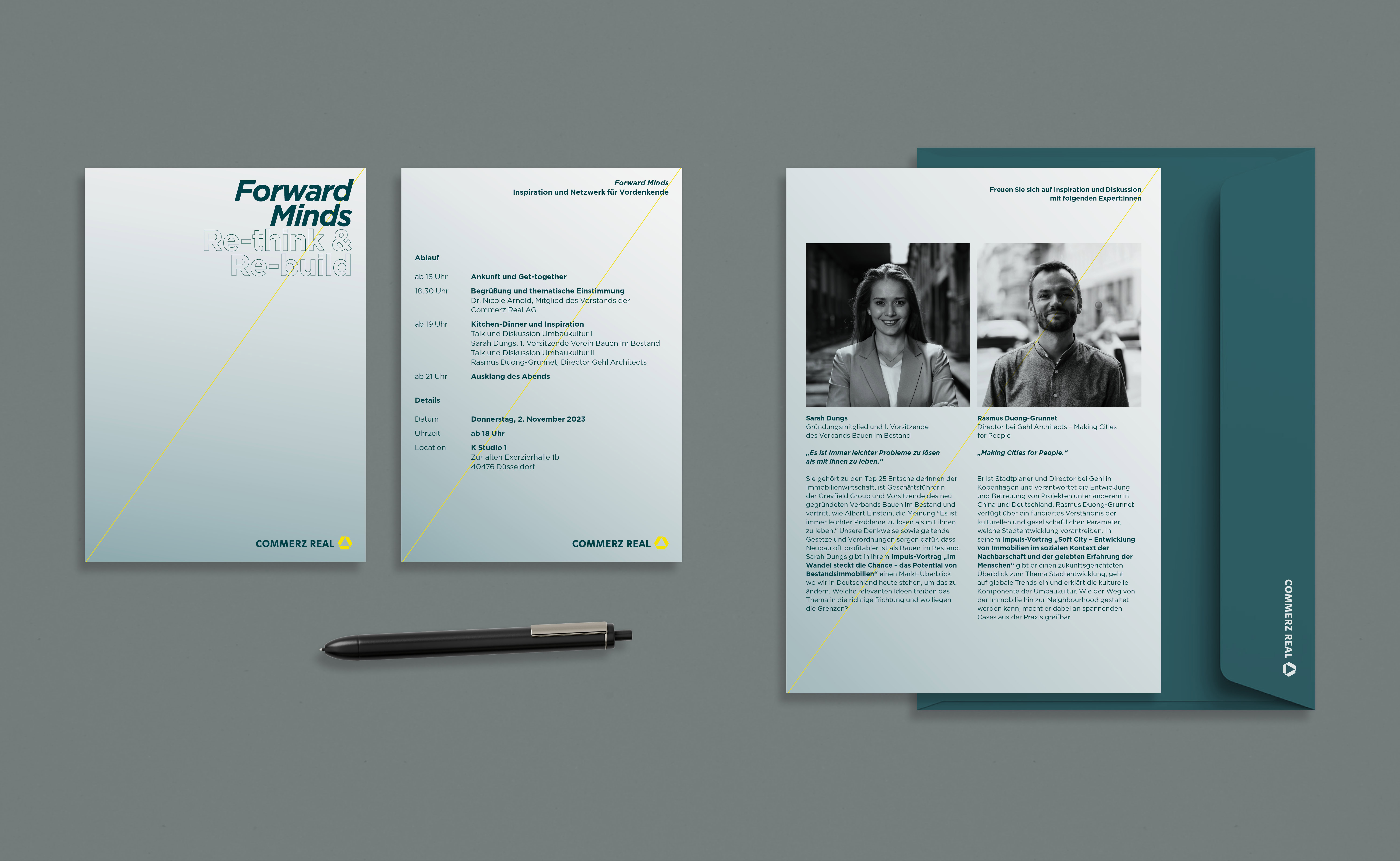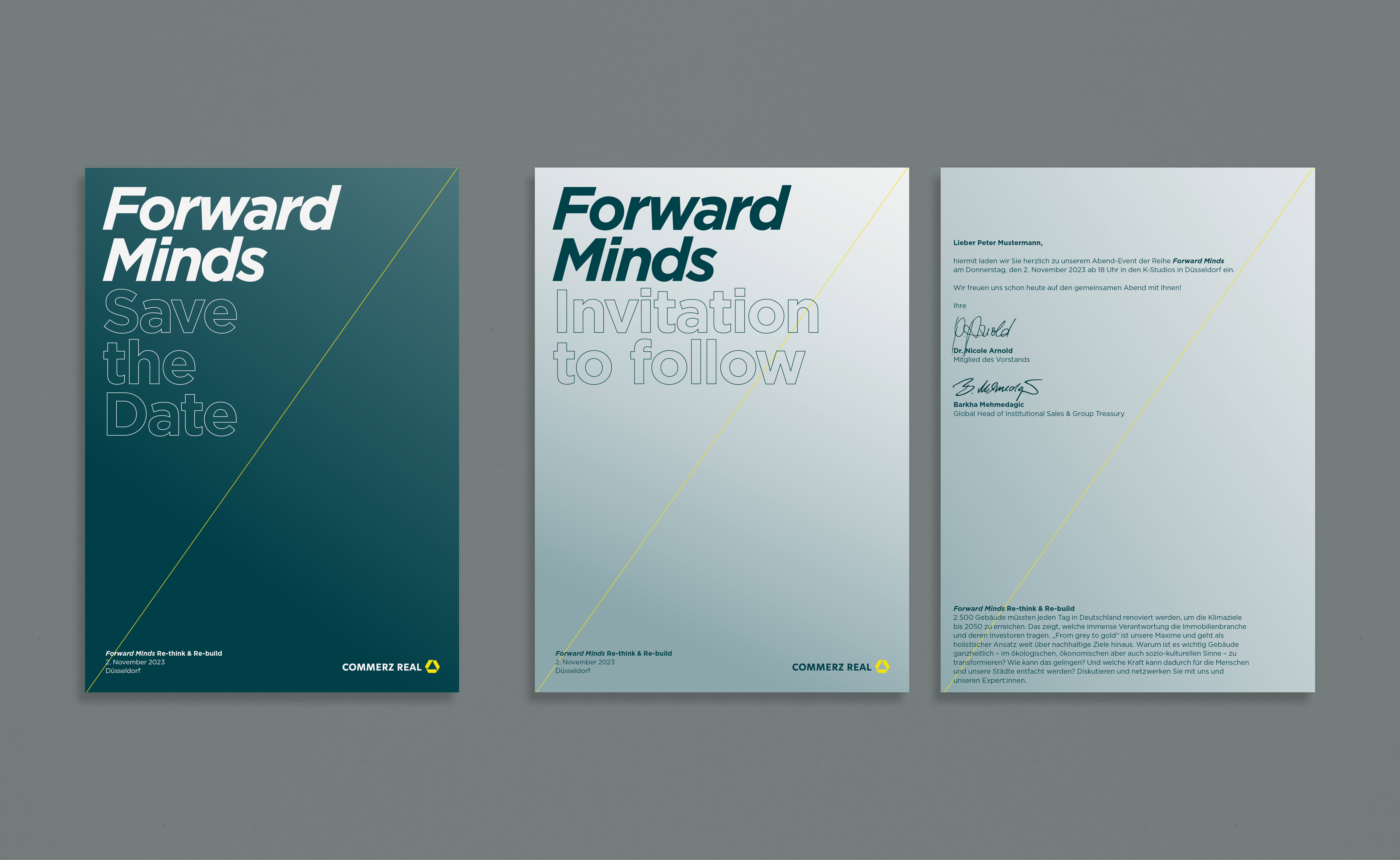 Für das Eventformat Forward Minds entstand ein reduziertes, konsistentes Gestaltungssystem. Eine feine gelbe Diagonale in Primärfarbe dient als visuelles Leitmotiv für Aufbruch und Zukunftsorientierung. Das Design vermittelt eine klare, moderne und zurückhaltende Tonalität.