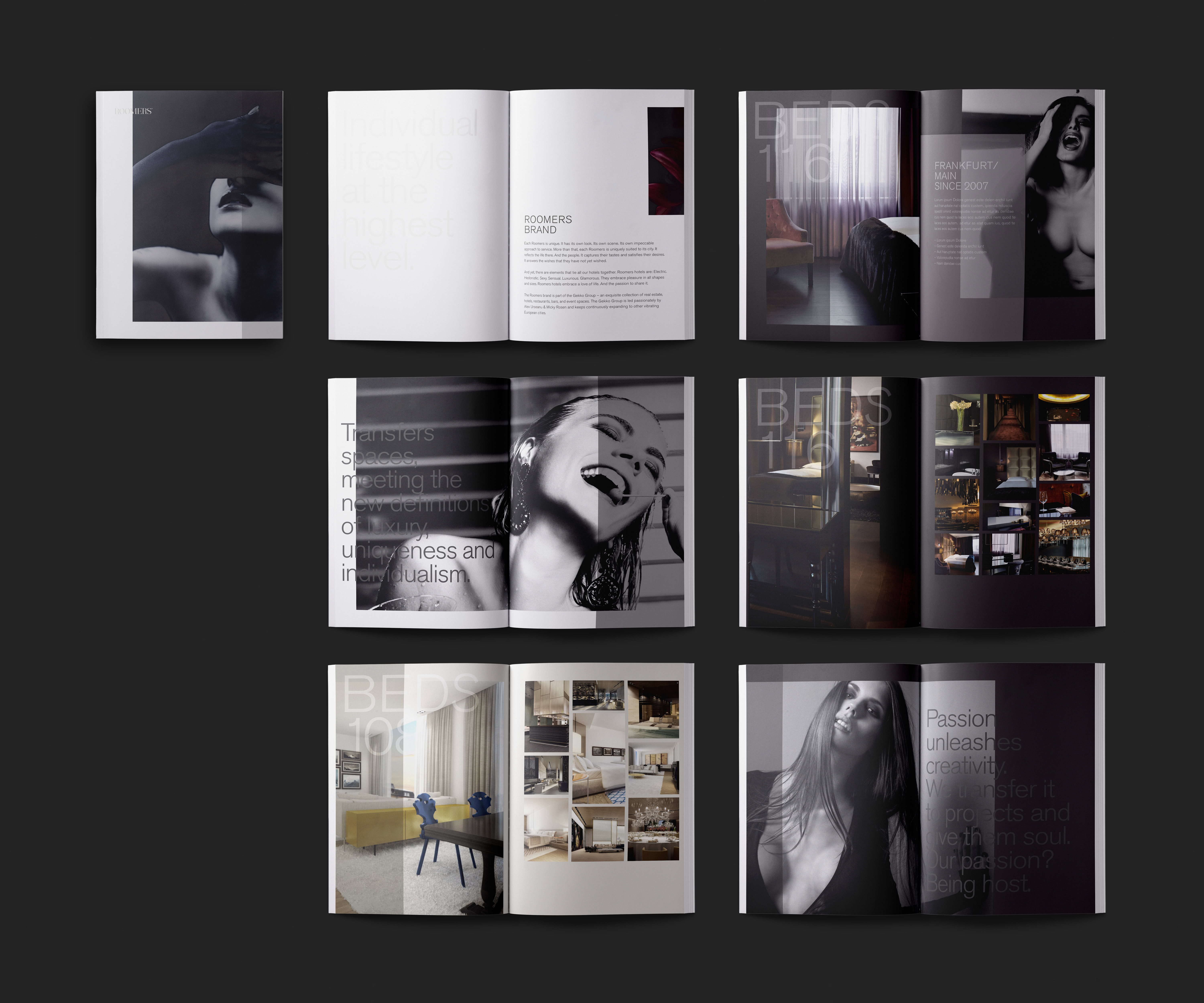 Das Brandbook vereint konkrete und emotionale Inhalte auf Bild- und Textebene. Die elegante, zugleich prägnante Gestaltung und die hochwertigen Materialien zahlen wirkungsvoll auf die Marke Roomers ein.