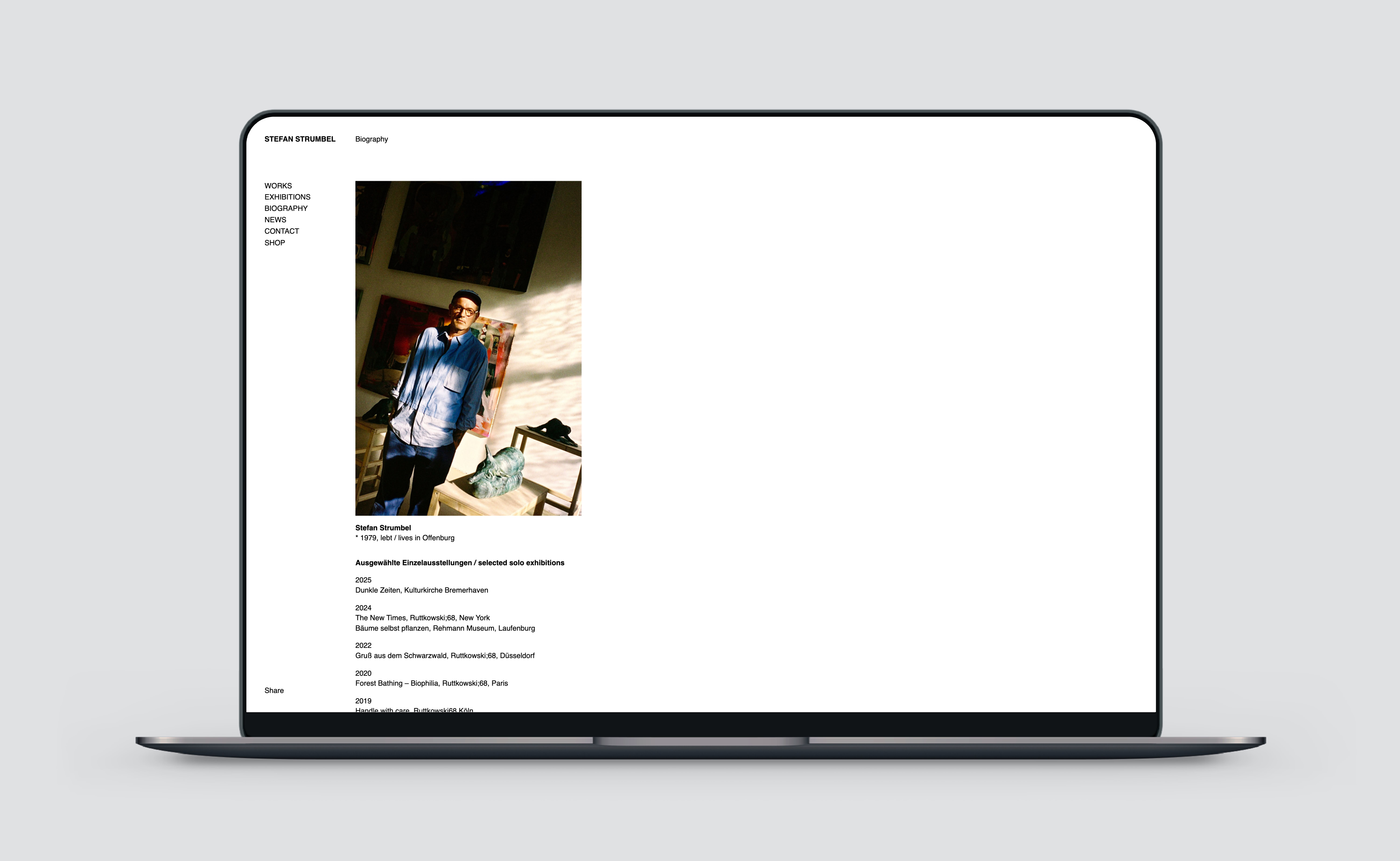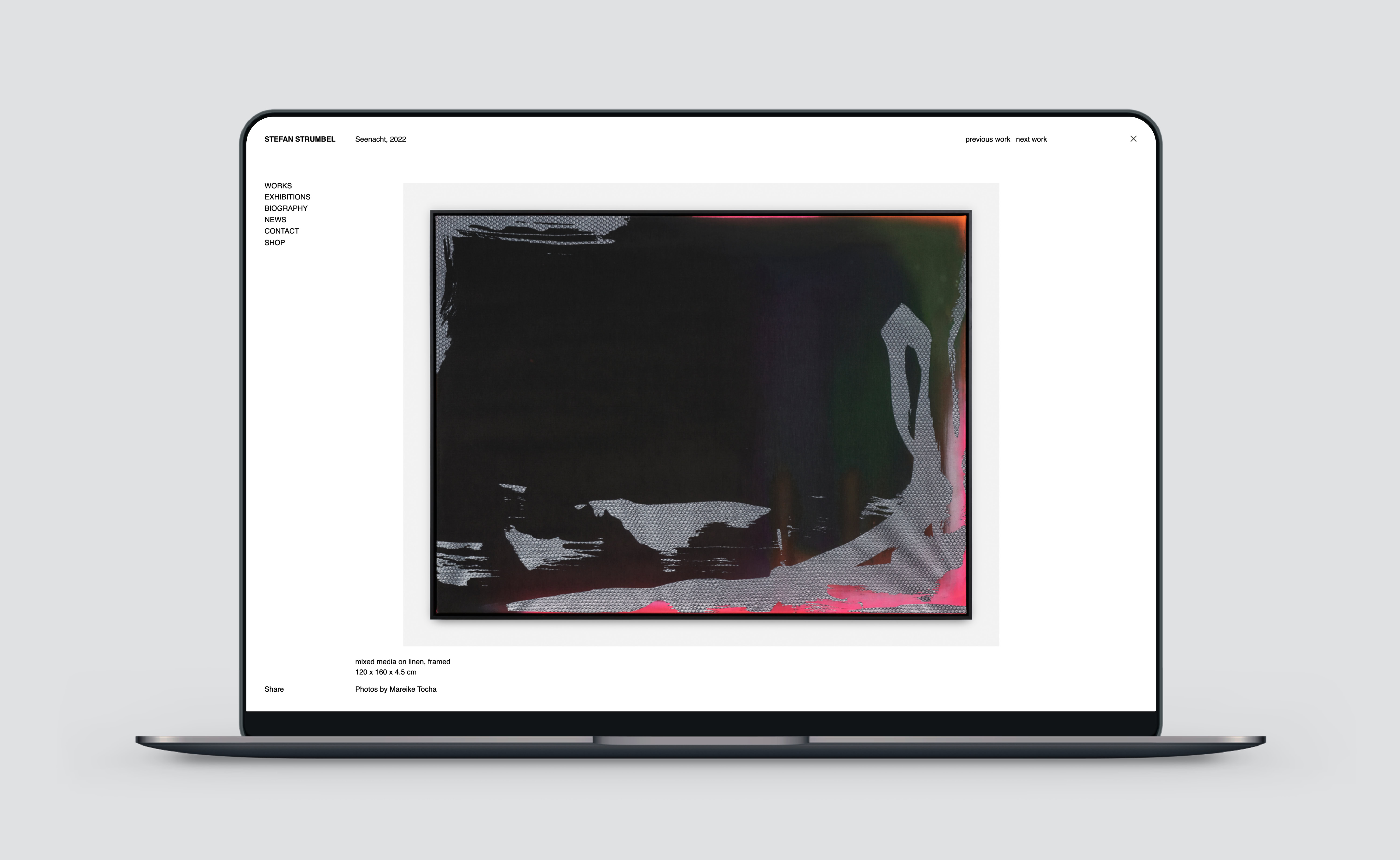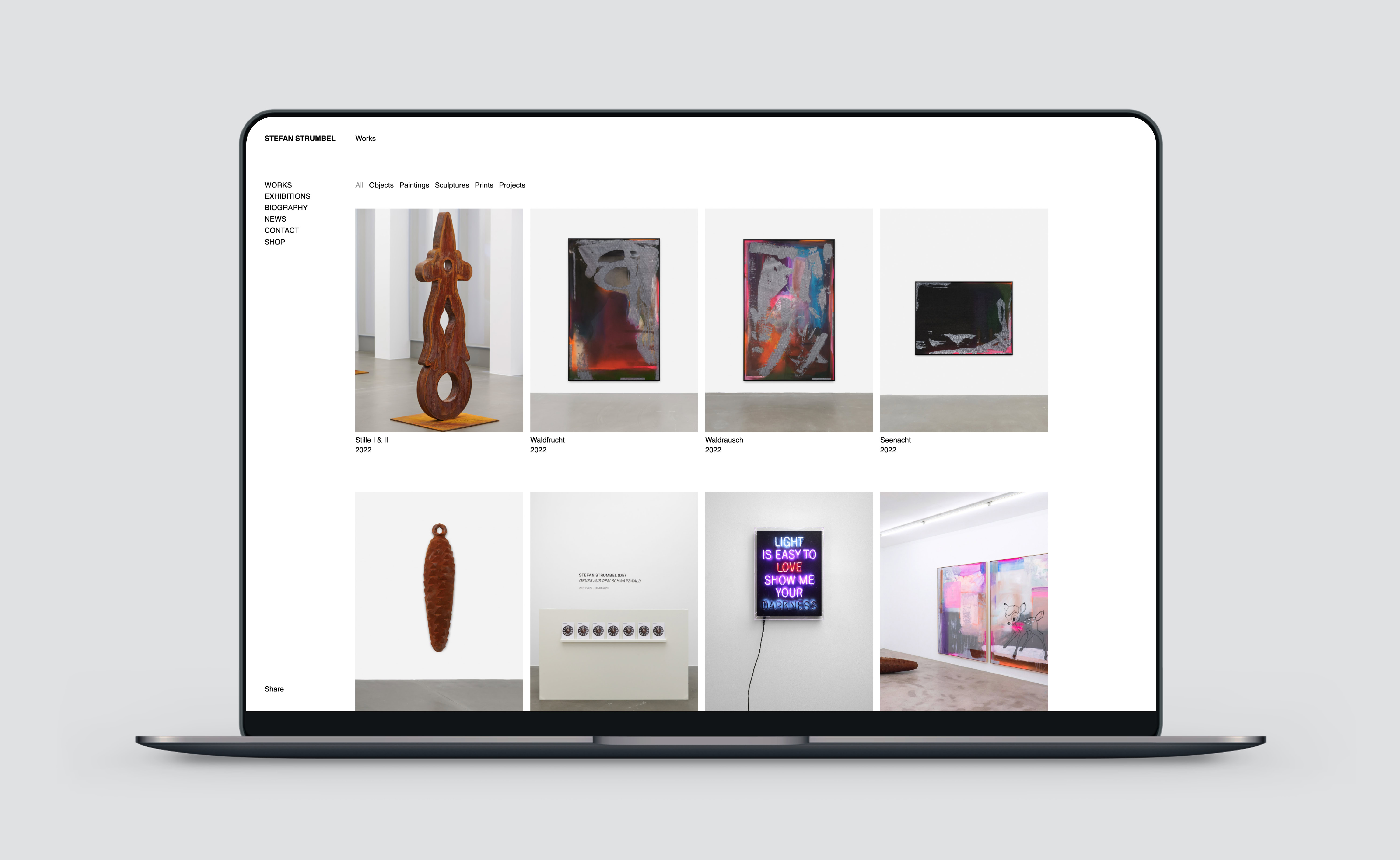 Die digitale Präsenz wurde bewusst zurückhaltend gestaltet. Klare Strukturen, großzügige Weißräume und eine reduzierte Formsprache rücken die Kunst in den Mittelpunkt. Die Seite verzichtet auf visuelle Ablenkung – und schafft damit eine Bühne, auf der die Arbeiten uneingeschränkt wirken können.